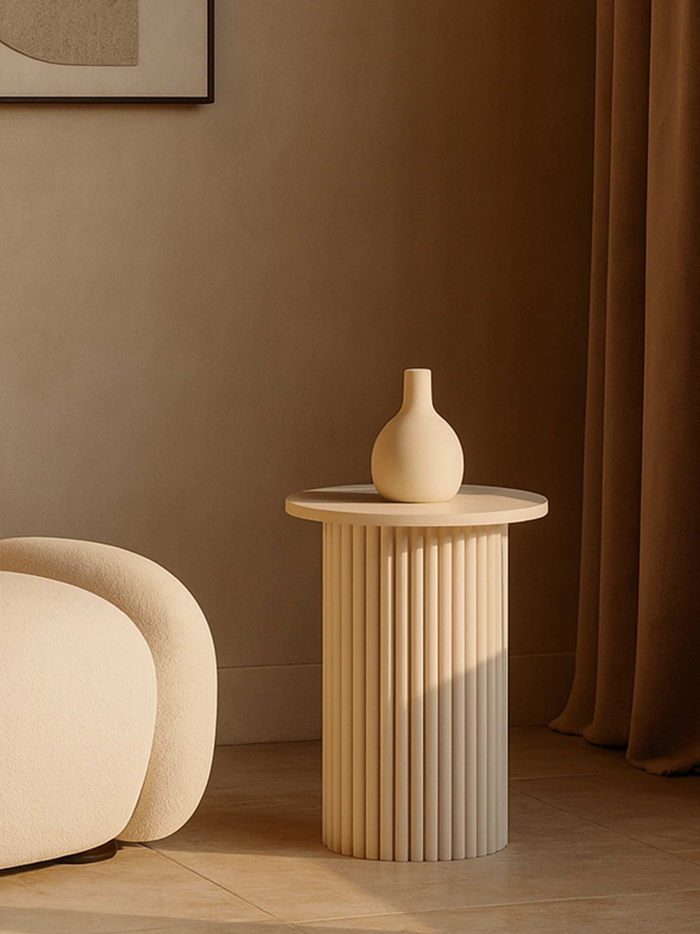 Excepcionales mesas de centro con tablero redondo y pata acanalada en varios tamaños y colores , pueden hacerse un hueco en el salón, el dormitorio o incluso el cuarto de baño y servir como mesas auxiliares o floreros.