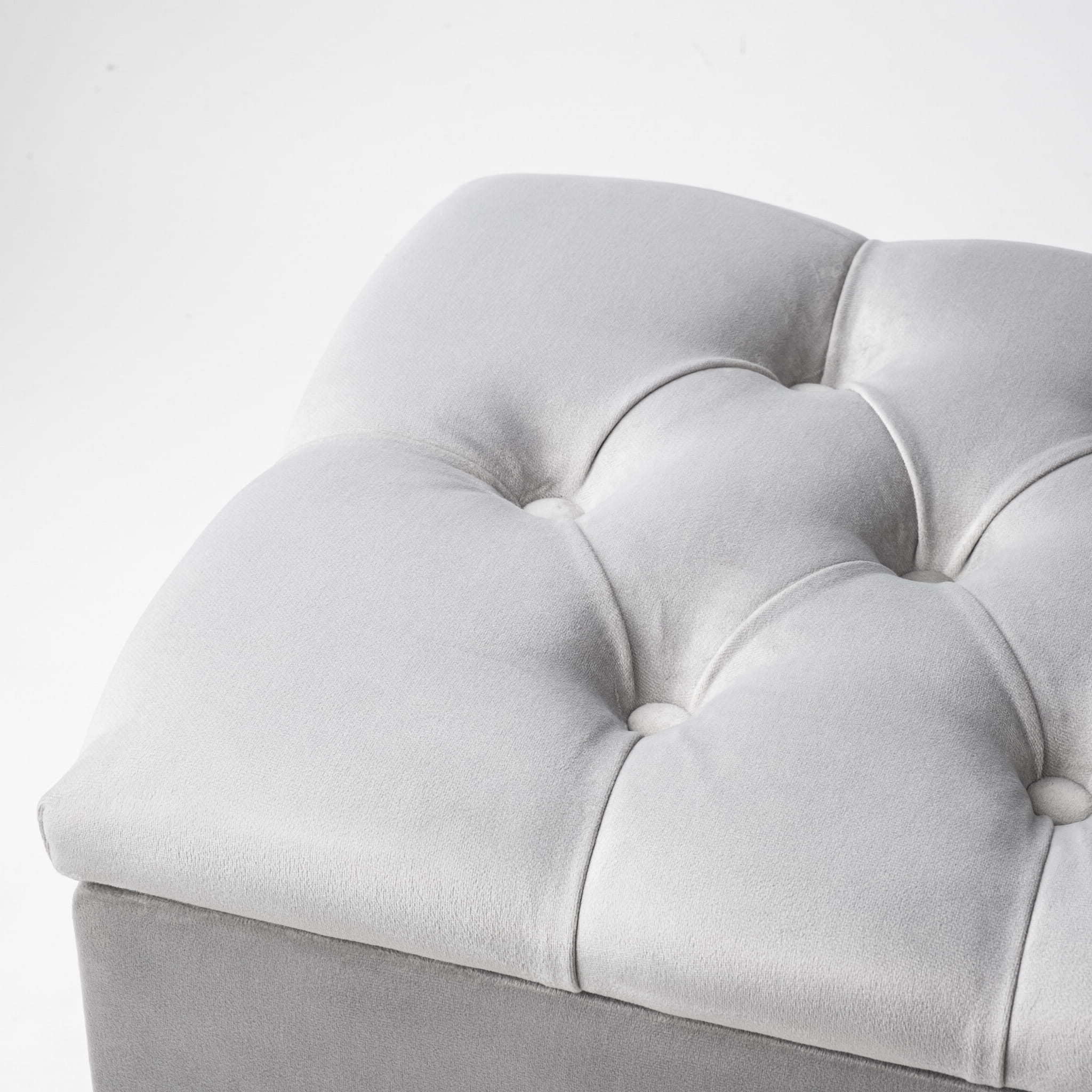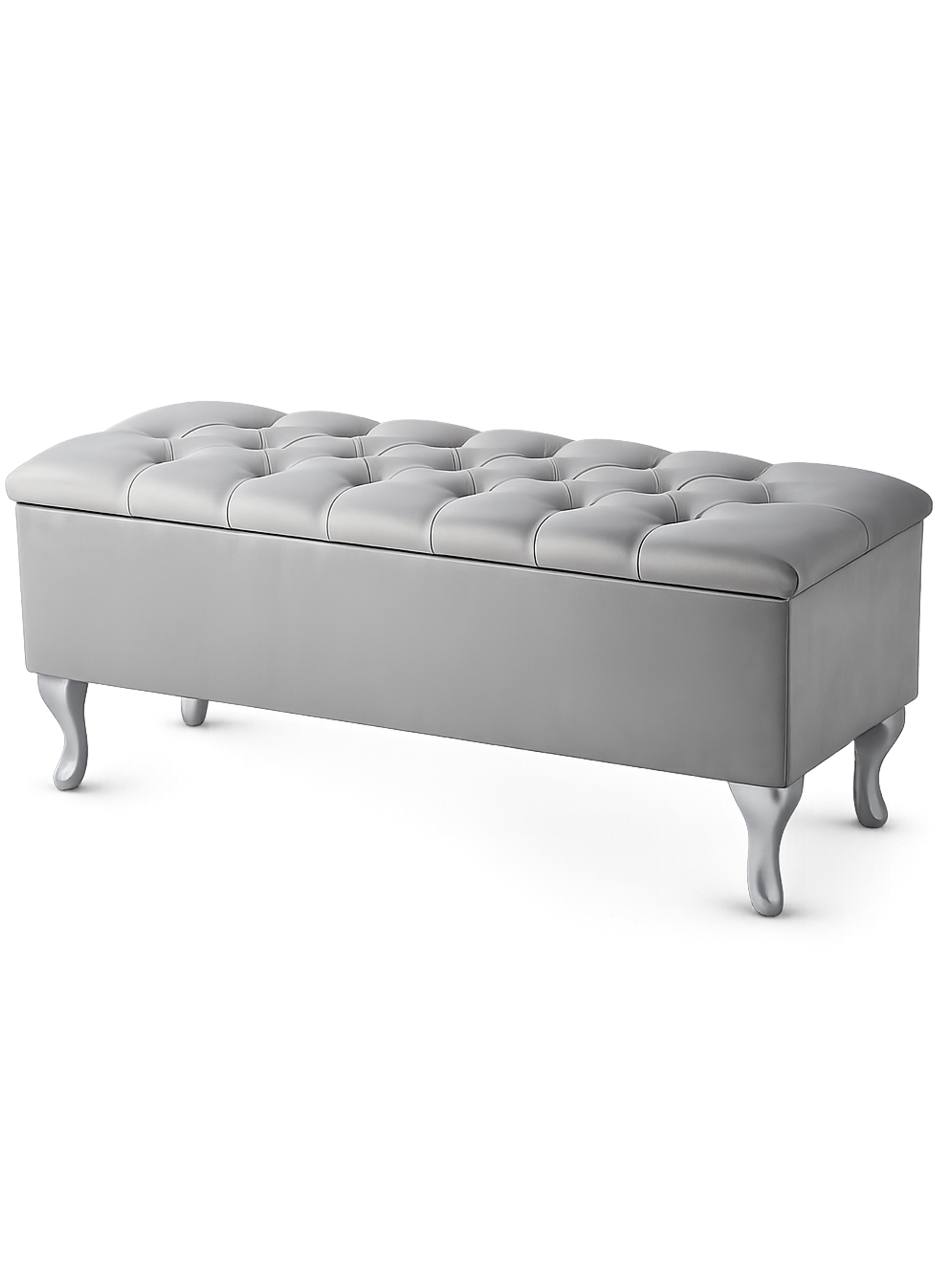 El luminoso y brillante color gris de la tela se yuxtapone con las patas plateadas. Una composición así es sin duda un estilo elegante. El maletero de este banco es alto y espacioso. Se abre con bisagras silenciosas accionadas por resorte. El asiento es mullido gracias a la espuma hipoalergénica y densa del tapizado y a la guata. Los laterales de la caja están acolchados con esponja y el conjunto está recubierto de tejido con certificado Oeko-Tex. Las patas de este puf con caja de almacenaje son de madera de haya de clase A. Están pintados con barniz resistente al desconchado.